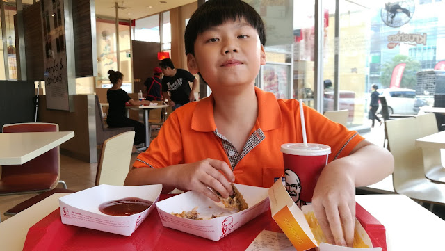 ตอนบ่ายๆ ป่าป๊าไปรับโมชิ ตอนแรกหม่าม๊าจะไปรับ แต่กลับจากพาอาม่าไป รพ. มารร. ก็รถติดมากไปไม่ไหว ให้ป่าป๊าไปแทน ป่าป๊ารับโมชิกลับมาก็พาไปกินเคเอฟซี